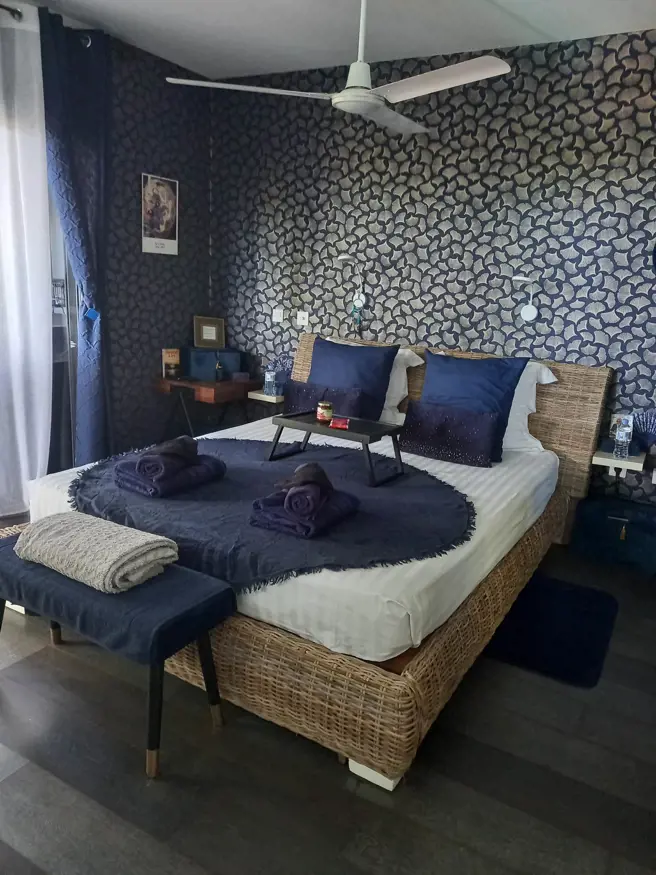 Suite INDIGO , chambre chez l' habitant à la réunion, avec jacuzzi privé donnant sur la piscine, salle d'eau avec WC, dressing, frigo, micro-ondes.